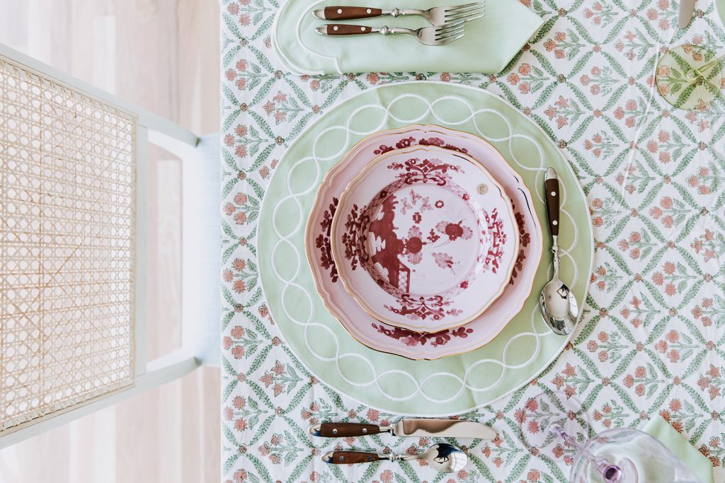 With the color scheme in place, I found a tablecloth with the same touches of pink found in the porcelain plates. This tablecloth adds a texture with its playful green and pink block print. The tablecloth is made from cotton, is budget friendly and launders well.