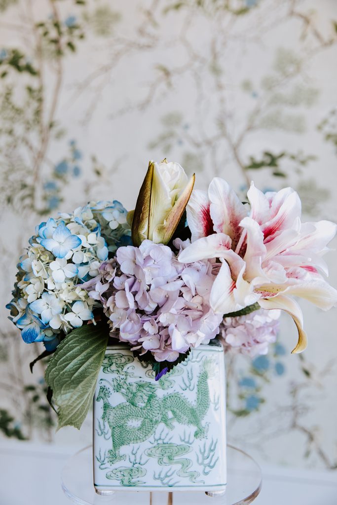 Arranging flowers can be daunting. But your floral arrangement doesn’t have to be over-the-top to be beautiful. I like to use vessels that make it simple and easy. Silver plated mint julep cups are a favorite of mine. Only about four inches tall, mint julep cups can be found online or (if you’re lucky) at an antique store. Pop a grouping of four or five roses in each cup, add a touch of greenery, and there you have it! Place four or five of these arrangements down the table for a simple yet effective look.